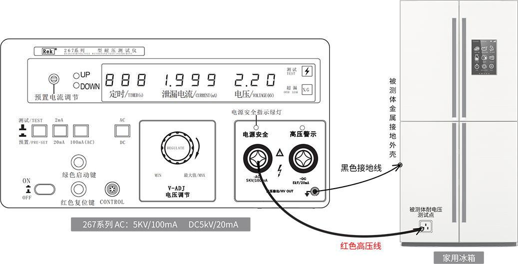 1、將儀器高壓輸出連接到冰箱電源輸入端(L.N并在一起)網電部份。儀器接地端(回路)接到冰箱地端。