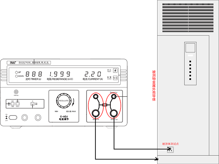 4:測試夾分別接到被測設備的大地(電源輸入端地線)和外殼的保護地(裸露的金屬部件),確保測試點導通,否則調不出測試電流。