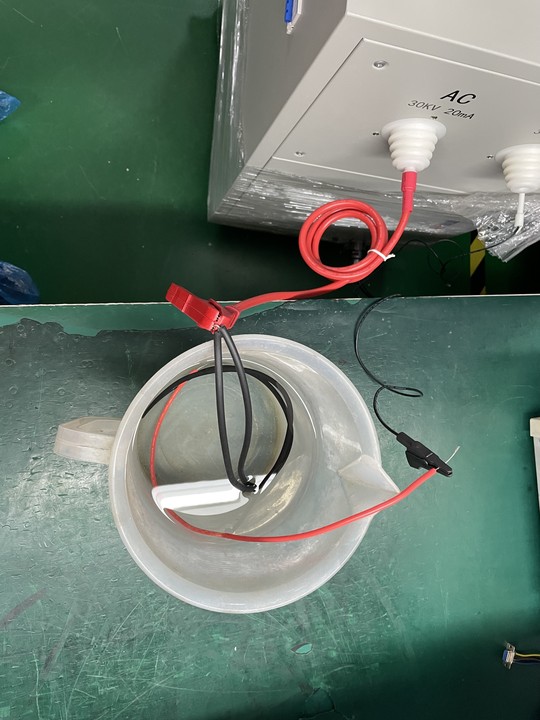首先是對被測物處理:拿住線材兩端剝去2厘米左右長度絕緣層,將兩個線芯擰在一起并接到高壓輸出端上。拿個塑料盆子裝盆清水,把線材放入水中(線芯不要沾到水),把儀器回路端放到清水中。接線完成打開儀器開關,慢慢調節電壓,觀察電流上升情況。如線材絕緣性能不好,電流會不斷上升,最終觸發報警產品不合格。